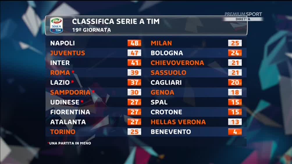 Nell’ultima partita del Girone di andata e del 2017, la Juventus risponde al Napoli e batte 3-1 al “Bentegodi” l’Hellas Verona e si riporta ad un punto dagli azzurri. Considerando i passi falsi di Inter e Roma, sarà questo il duello del 2018 per lo Scudetto. Partita che sembra subito in discesa per i bianconeri in vantaggio al 6′ con Matuidi dopo che poco prima nella stessa azione Higuain aveva colpito un palo. Ma i padroni di casa non mollano, lottano e ad inizio ripresa pareggiano con un tiro da fuori di Caceres. Nel momento migliore della squadra di Pecchia che sembra anche voler provare a vincere la partita, arriva il nuovo vantaggio juventino: al 71′ Lichtsteiner dalla destra serve un cross perfetto per Dybala che segna e torna al gol nel momento più importante per la Juve.