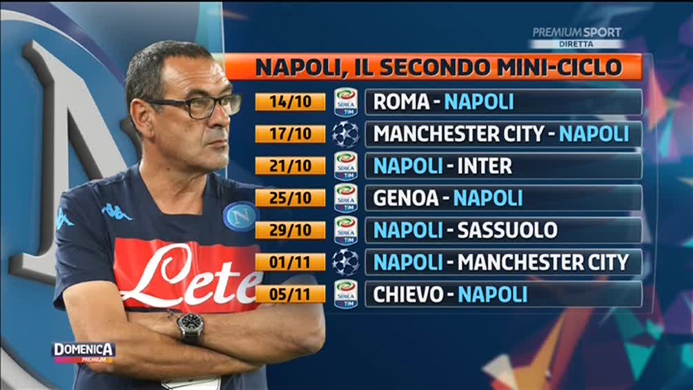 Dopo la sosta in campionato il Napoli è atteso ad un vero e proprio tour de force. Gli azzurri giocheranno 7 partite nel giro di 21 giorni. Si inizia sabato 14 ottobre contro la Roma e si conclude il 5 novembre con il Chievo. Nel mezzo il doppio confronto contro il Manchester City di Guardiola e la sfida in campionato contro l’Inter.