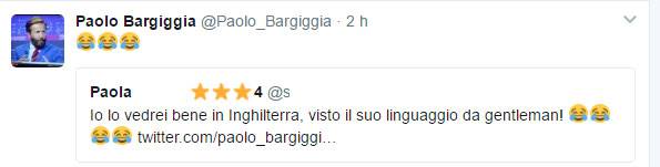 Ancora un tweet provocatorio da parte di Paolo Bargiggia nei confronti di Maurizio Sarri. Il giornalista di Mediaset, che sembra non avere grandissima stima nel tecnico azzurro, aveva ieri scritto un messaggio su Twitter dove punzechiava Sarri. Oggi, invece, ha retwittato un messaggio di sfottò di un tifoso: “Io lo vedrei bene in Inghilterra, visto il suo linguaggio da gentleman”.