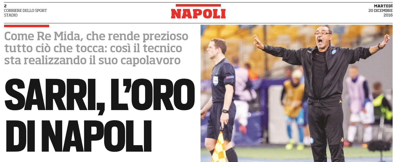 L’edizione odierna del Corriere dello Sport mette in evidenza il grande lavoro della società azzurra e del tecnico che ha ottimizzato in modo esemplare le risorse messe a disposizione dal patron: “L’oro di Napoli ha un valore inestimabile, perché è fuori mercato, non entra in trattativa, non si lascia solleticare da tentazioni che pure non sono mancate: è incedibile Hamsik e lo sono stati anche Albiol, Callejon, Mertens; però con il Torino – calcolando gli investimenti per gli acquisti c’erano in campo 78 milioni di euro ed altri 73 aspettavano in panchina che arrivasse il loro momento, mentre altri 40 (Milik e Koulibaly) restavano in infermeria.