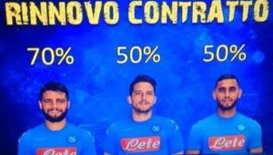Parliamo della situazione di Insigne, Mertens e Ghoulam che per svariati motivi non hanno ancora definito un accordo con la Società Sportiva Calcio Napoli. Durante il Bello del Calcio è stata determinata una percentuale di rinnovo di ciascuno riassunta nella foto che segue: Insigne rinnoverà con il Napoli al 70%, Mertens e Ghoulam al 50%