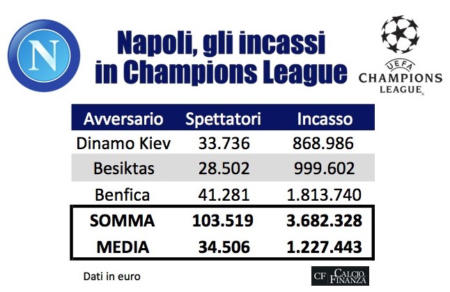 Il tutto senza considerare i ricavi da biglietteria. Per il Napoli, nelle tre gare della fase a gironi, gli incassi dalla vendita dei biglietti è stata complessivamente di 3,6 milioni di euro, di cui però quasi la metà nella sola gara contro il Benfica, all’esordio.