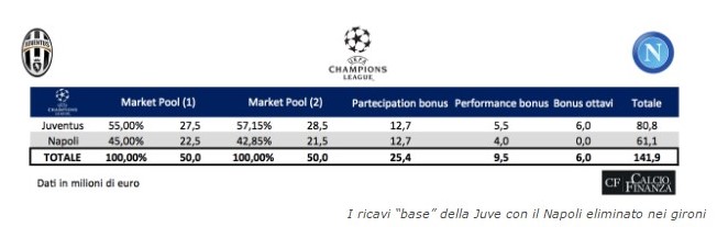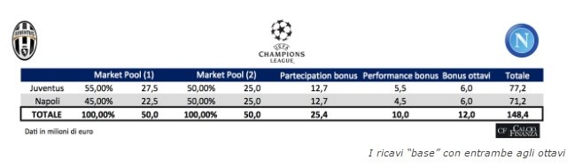 Nel caso in cui, invece, la squadra di Sarri centrasse gli ottavi (obiettivo per cui basta un pareggio col Benfica), fermandosi nel primo turno ad eliminazione diretta insieme alla stessa Juventus (disputando quindi 8 partite ciascuna su 16 delle italiane), i ricavi per gli azzurri si alzerebbero fino a superare i 70 milioni di euro, mentre i bianconeri sfiorerebbero gli 80 milioni.