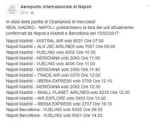 VocediNapoli ha anche contattato la Gesac per avere notizie in merito. Il codice del volo in questione non risulta mai essere esistito, tant’è che dalla società aeroportuale non hanno parlato di “volo cancellato” bensì di “volo fantasma”. Inoltre sulla pagina Facebook dell’Aeroporto di Capodichino è stato pubblicato un riepilogo degli aerei per Madrid e Barcellona del 15 febbraio per chiarire la situazione. Ci sarebbe preoccupazione per domattina quando si teme che molti tifosi si rechino a Capodichino non sapendo della cancellazione del volo e delle lamentele di questi ultimi.