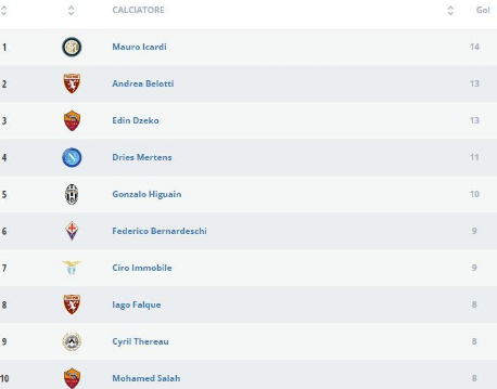 Dries Mertens vola al 4° posto nella classifica marcatori con 11 reti realizzate in questo campionato, dietro ad Icardi, Dzeko e Belotti. Il belga, con il gol di ieri, ha lasciato dietro Higuain. Ecco la classifica marcatori: