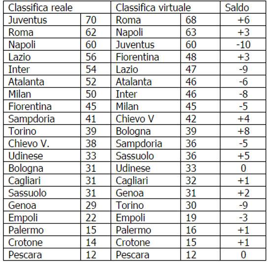 CLASSIFICA SENZA ERRORI ARBITRALI – La Juve scivola al terzo posto, Napoli secondo