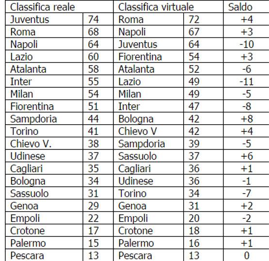 I colleghi di AreaNapoli.it hanno pubblicato la classifica aggiornata senza errori arbitrali. Al comando la Roma con 72 punti, Napoli secondo a 67. La Juventus con un differenziale negativo di ben 10 punti è al terzo posto con 64 punti. Balzo in avanti della Fiorentina al quarto posto e del Bologna che recupera ben 5 posizioni rispetto alla classifica reale.