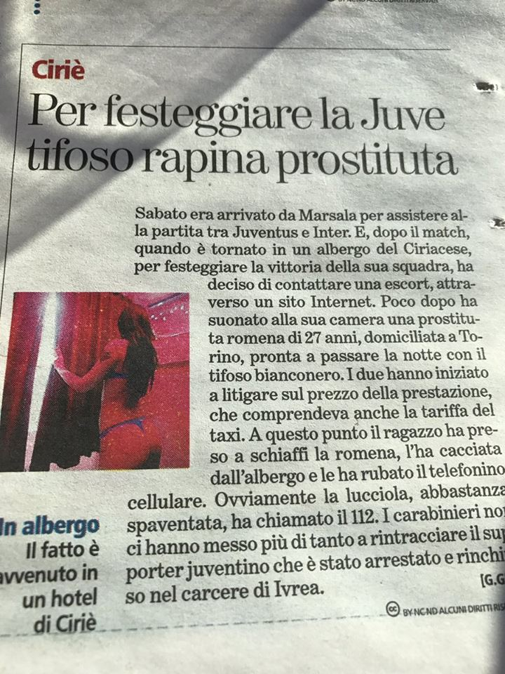 Dopo aver visto la partita della “sua” Juventus sull’Inter, la sera di domenica 5 febbraio ha rapinato una prostituta poiché non aveva trovato un accordo sul compenso. E’ avvenuto in un albergo di via Torino, a San Francesco al Campo, dove i carabinieri sono intervenuti per arrestare un italiano di 36 anni, tifoso bianconero, venuto a vedere la sfida dello Juventus Stadium da Marsala (Trapani).