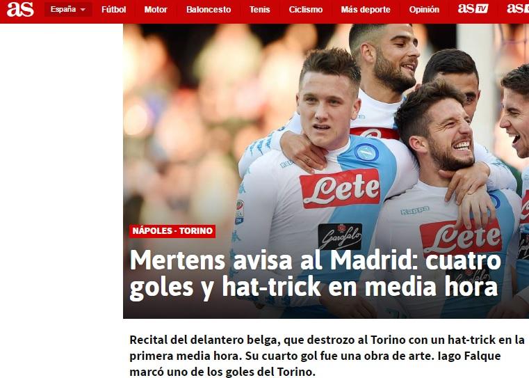 La sontuosa esibizione calcistica del Napoli ha fatto rumore anche in Spagna. Il quotidiano iberico, AS, titola la cronaca della gara “Mertens avvisa il Real: quattro gol e tripletta in mezz’ora”.