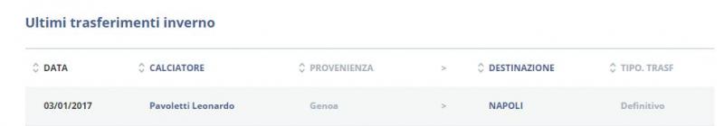 Anche la Lega Serie A ufficializza il passaggio di Pavoletti al Napoli. Sul sito ufficiale della Lega, infatti, compare proprio il trasferimento dell’attaccante a titolo definitivo. Ecco la foto: