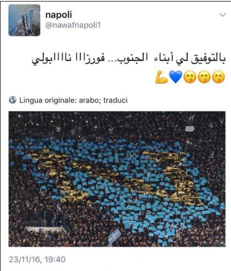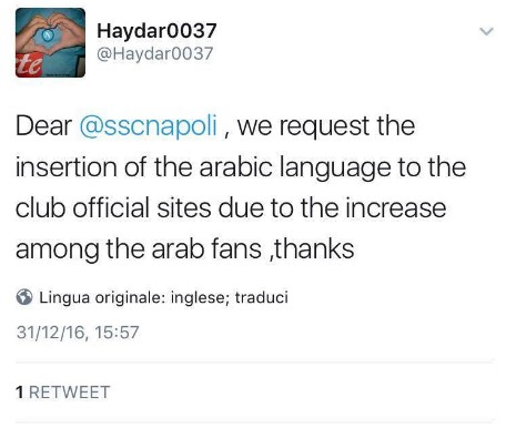 Ma anche grazie a Mertens e Insigne, oltre a Callejon, Reina e gli altri, si sta sviluppando l’interesse intorno alla squadra partenopea tanto che non sono pochi coloro che chiedono al club di De Laurentiis una versione araba dei propri canali ufficiali visto che per ora sul sito ufficiale c’è solo la versione spagnola, inglese e cinese. Ecco alcune immagini che testimoniano la grande richiesta dei tifosi arabi: