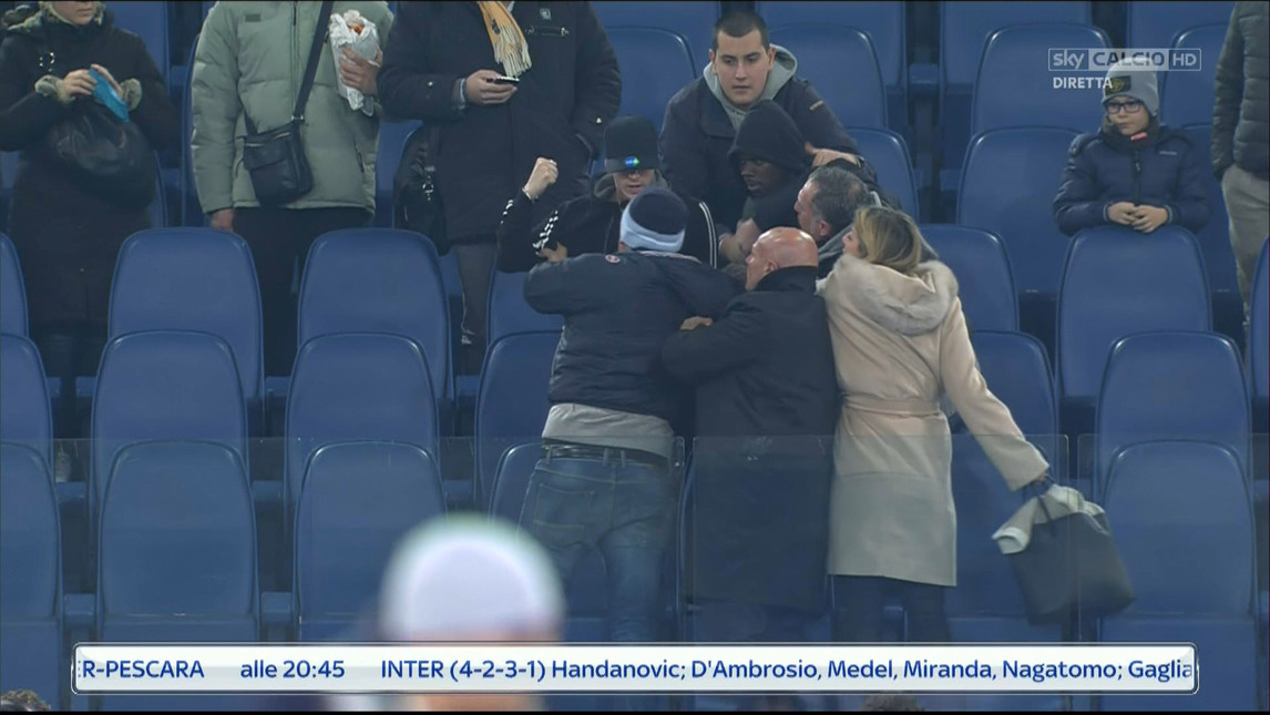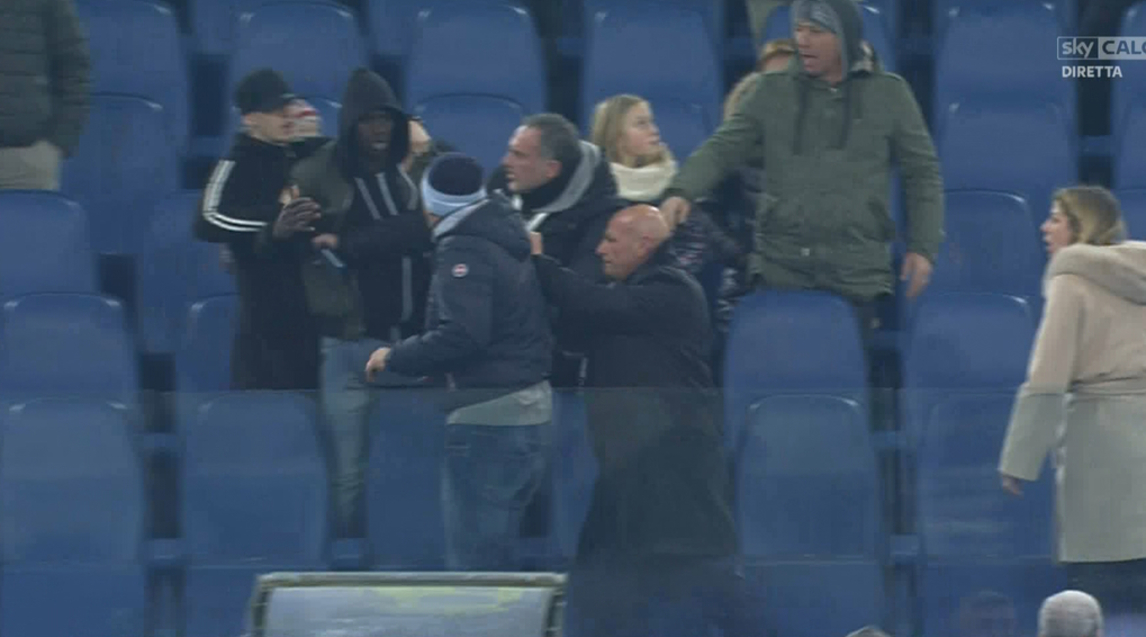 Solo l’intervento dei magazzinieri della Lazio ha impedito che i due venissero alle mani con l’argentino pronto a scavalcare le transenne. Subito dopo è stato l’attaccante 21enne della Primavera Mamadou Tounkara (seduto in tribuna) a raggiungere il tifoso per rispondere ai suoi insulti al compagno e per difendere la moglie dell’argentino, che si trovava in quel settore dello stadio. Addirittura c’è chi parla di Daspo per il giocatore della Lazio. Seguiranno aggiornamenti.