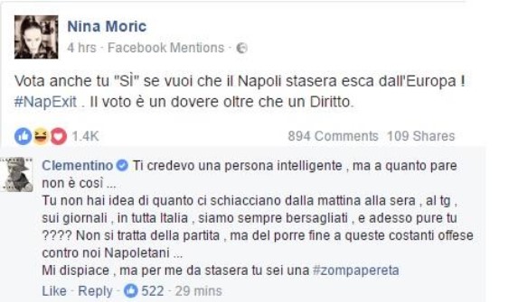 Acceso botta e risposta su Facebook tra Nina Moric e il rapper partenopeo Clementino. La show-girl ha pubblicato un provocatorio messaggio contro il Napoli in vista del match di stasera (“Vota anche tu “SÌ” se vuoi che il Napoli stasera esca dall’Europa ! #NapExit . Il voto è un dovere oltre che un Diritto“) al quale il noto rapper napoletano ha risposto così: