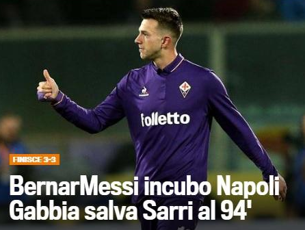 La Gazzetta dello Sport dedica la sua apertura dell’edizione online alla prestazione di Federico Bernardeschi contro gli azzurri, paragonandolo addirittura a Messi: “BernarMessi incubo Napoli. Gabbiadini salva Sarri”.