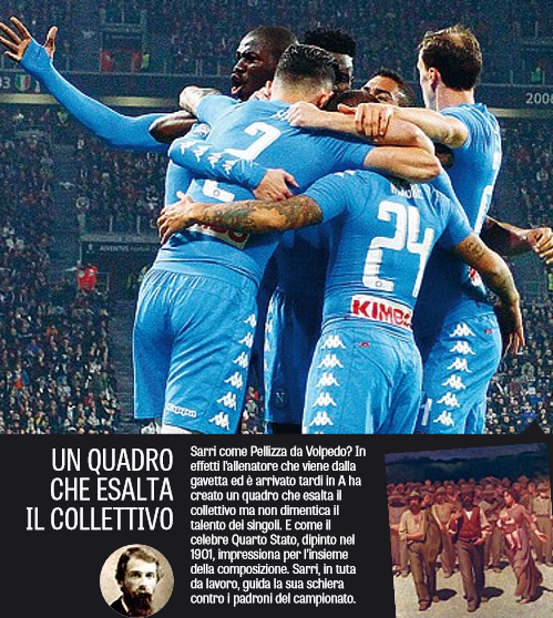 E come il celebre Quarto Stato, dipinto nel 1901, impressiona per l’insieme della composizione. Sarri, in tuta da lavoro, guida la sua schiera contro i padroni del campionato”.