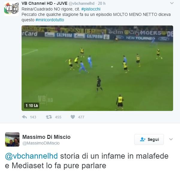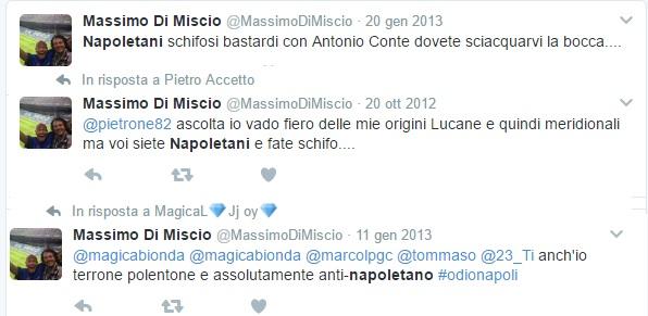Di Miscio ha in questi giorni pesantemente insultato alcuni giornalisti ‘colpevoli’ a suo dire di raccontare le sviste arbitrali di Juventus-Napoli definendoli “infami e in malafede”. Andando a ritroso nei suoi tweet (tutti rigorosamente pubblici, come il suo profilo), inoltre, spuntano offese ancora più gravi, questa volta dirette a tutta la città di Napoli: “Napoletani schifosi bastardi”, “siete napoletani e fate schifo”, “sono assolutamente anti-napoletano, #odionapoli”. Inutile aggiungere altro, ecco i post.