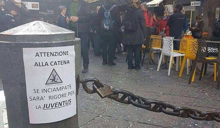 Ecco l’ultima trovata dei napoletani in seguito agli errori arbitrali del signor Valeri durante Juve-Napoli. Su una colonnina di piperno del centro storico della città è apparso un manifesto al fianco di una catena dove si legge: “Attenzione alla catena, se inciampi sarà rigore per la Juve!”, alludendo alla faciltà con cui gli arbitri assegnano i rigori a Madama (quatte solde, direbbe il buon Eduardo Scarpetta).