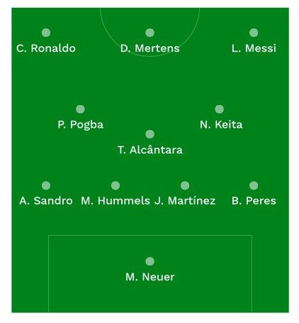 In attacco c’è la rivelazione del campionato, quel Dries Mertens scopertosi centravanti e autore di 31 goal, affiancato da Ronaldo e Messi. In porta Neuer.
