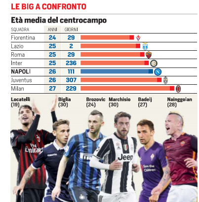 L’edizione odierna del Corriere dello Sport riporta un grafico con l’età media dei centrocampi della Serie A, soffermandosi ovviamente su quello azzurro: “Sessantadue anni portati benissimo. Un centrocampo fresco, forte e versatile che vive nel presente e guarda al futuro: complimenti vivissimi, giovanotto. Anzi, giovanotti: Amadou Diawara, 19 anni; Marko Rog 21 anni; Piotr Zielinski, 22 anni. Sessantadue anni, per l’appunto, e 58 milioni in tre”.