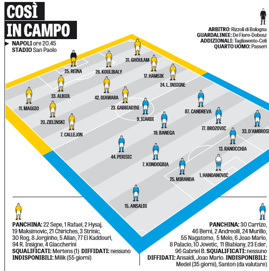 Di conseguenza, in panchina andrà l’esterno offensivo Roberto Insigne, il giovane fratello di Lorenzo, anche perché Mertens è squalificato e oltre ad El Kaddouri non ci sono altri attaccanti in organico. Maggio dovrebbe essere preferito ad Hysaj a destra, ballottaggio vivo tra Zielinski e Allan. Rispetto al Sassuolo, rientreranno Albiol, Diawara e Ghoulam. Domani di nuovo tutti in campo, martedì ci si gioca la Champions contro il Benfica. Saranno 1.500 i tifosi del Napoli a Lisbona.