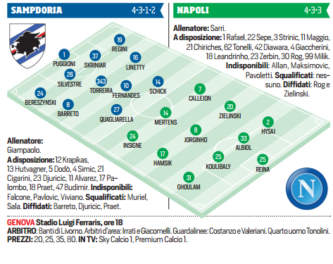L’edizione odierna del Corriere dello Sport riporta il grafico con le probabili formazioni di Samp-Napoli: “I dubbi ci sono, e ci mancherebbe: lo stesso Albiol, che s’è fermato per due giorni e dunque potrebbe lasciare a Chiriches o a Tonelli, destinati nel caso a stare al fianco di Koulibaly; perplessità che si estendono.
