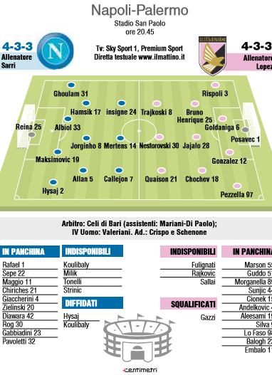 Nel grafico del Mattino con le probabili formazioni di Napoli-Palermo, c’è Reina in porta, con Albiol e Maksimovic in difesa, sulla destra Hysaj, a sinistra il ritorno di Ghoulam. Centrale Jorginho con Hamsik e Allan ai suoi lati. Mentre in attacco nessuna novità, è pronto il tridente dei piccoletti. Possibile staffetta tra Mertens e Pavoletti, ma solo nel secondo tempo del match.