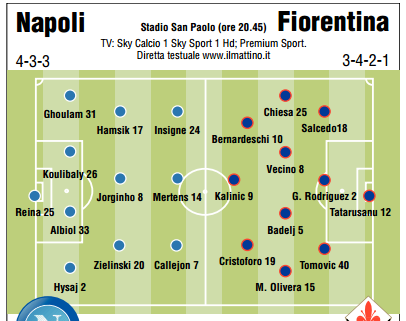 Nel grafico con le probabili formazioni del Mattino c’è Reina con Hysaj, Albiol, Koulibaly e Ghoulam in difesa, a centrocampo Zielinski, Jorginho e Hamsik, in attacco il solito trio dei piccoletti.