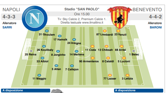 L’edizione odierna del Mattino, nel grafico con le probabili formazioni di Napoli-Benevento, mette Reina in porta, Maggio a destra, Albiol e Koulibaly centrali, Ghoulam a sinistra. A centrocampo Allan, Jorginho e Hamsik, davanti i tre piccoletti, Callejon, Insigne e Mertens. Pochi cambi per Sarri, l’unica novità sarebbe rappresentata da Maggio in luogo di Hysaj.