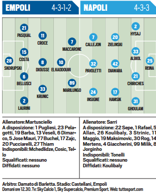 L’edizione odierna di Tuttosport prova ad anticipare le scelte di Maurizio Sarri in vista della partita di domani all’ora di pranzo ad Empoli: in difesa dovrebbe esserci l’avvicendamento tra Albiol e Koulibaly: il senegalese è diffidato e Sarri non vuole rischiare di perderlo per la Juve. Con lo spagnolo Hysaj e Ghoulam, oltre a Chiriches, favorito su Maksimovic.
