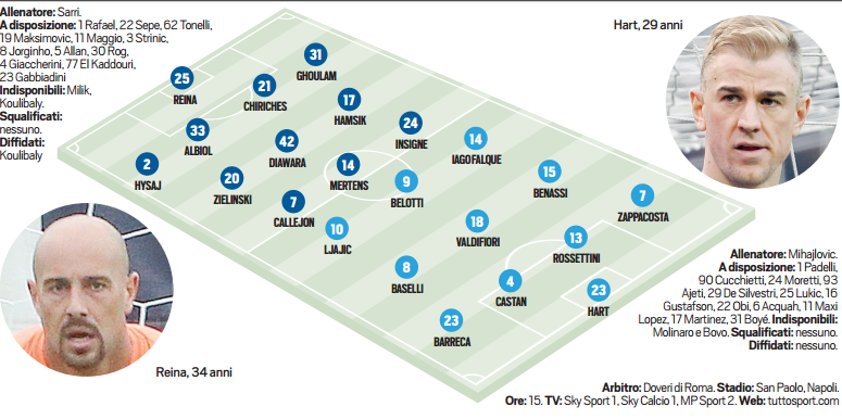 Grafico formazioni – Sarri ha scelto Chiriches! Centrocampo “bomba” più Hamsik, in attacco i “tre/tre”