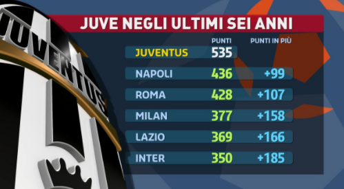 Tiki Taka, trasmissione in onda su Italia 1, ha pubblicato un interessante grafico che mostra la classifica delle squadre con maggior punti ottenuti negli ultimi sei anni. Sul gradino più basso del podio c’è la Roma con 428 punti. Il Napoli si piazza al secondo posto con 436 punti. Sul gradino più alto la Juventus con 535 punti: ben 99 punti in più rispetto ai partenopei. Di seguito la classifica completa.