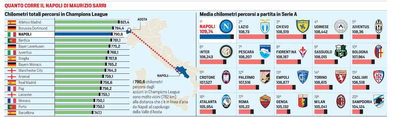 L’edizione odierna del Corriere dello Sport, analizza le squadre che corrono di più. Il Napoli risulta quella che ha messo nelle gambe più chilometri. Ecco i dettagli: “è il calcio del Napoli, che se lo prende tutto, segna da diciotto partite di campionato, e non solo: mette assieme quattordici risultati consecutivi in serie A.