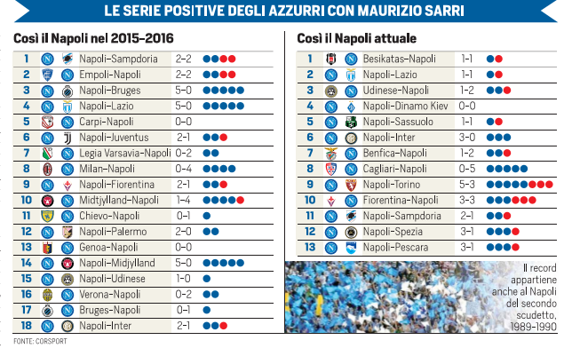 Il precedente appartiene alla passata stagione (2015/2016) e sciorinato praticamente subito. Sarri, da freschissimo insediato, subì una sconfitta all’esordio in quel di Reggio Emila (ad opera del Sassuolo) per poi inaugurare una sequenza infinita di risultati utili. La bellezza di diciotto in tre mesi: partendo dalla Samp in casa (30 agosto 2015) per arrivare all’Inter ancora a Fuorigrotta (30 novembre). Quattordici vittorie e quattro pareggi, vera e propria istantanea inversione di marcia da definirsi trionfale.