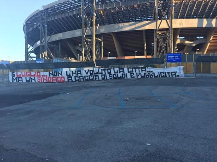 Spunta uno striscione polemico all’esterno del San Paolo contro il sindaco De Magistris e la festa di domani sera per il conferimento della cittadinanza onoraria a Maradona: “5 luglio…non l’ha voluto la città…ma un Sindaco a caccia di soldi e pubblicità”. Di seguito lo scatto: