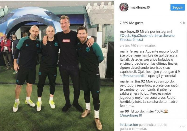 Maxi Lopez prova a sfidare Mauro Icardi giocando “in trasferta”: l’ex marito di Wanda Nara, infatti, ha lanciato una frecciatina al capitano dell’Inter tramite Instagram, da sempre terreno casalingo proprio del numero nove nerazzurro e della sua compagna. L’attaccante argentino, infatti, ha postato sul Social Network una foto tra Messi e Iniesta con la scritta “Mirala su Instagram, Guardala su Instagram”. Il riferimento di Maxi Lopez è duplice: non solo si parla della Champions League, che Mauro Icardi, con molta probabilità, non riuscirà a conquistare nemmeno questa stagione, ma anche (in particolar modo con il saluto a Messi) alla nazionale argentina, sempre più preclusa al giovane centravanti nerazzurro. Lo riporta passioneinter.it