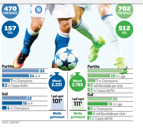 Lui, il falso nueve più “in” del momento, può vantare una media gol/minuti migliore di quella di Cristiano Ronaldo. Sua maestà il Pallone d’oro. Niente male per scaldare l’atmosfera di Napoli-Real,