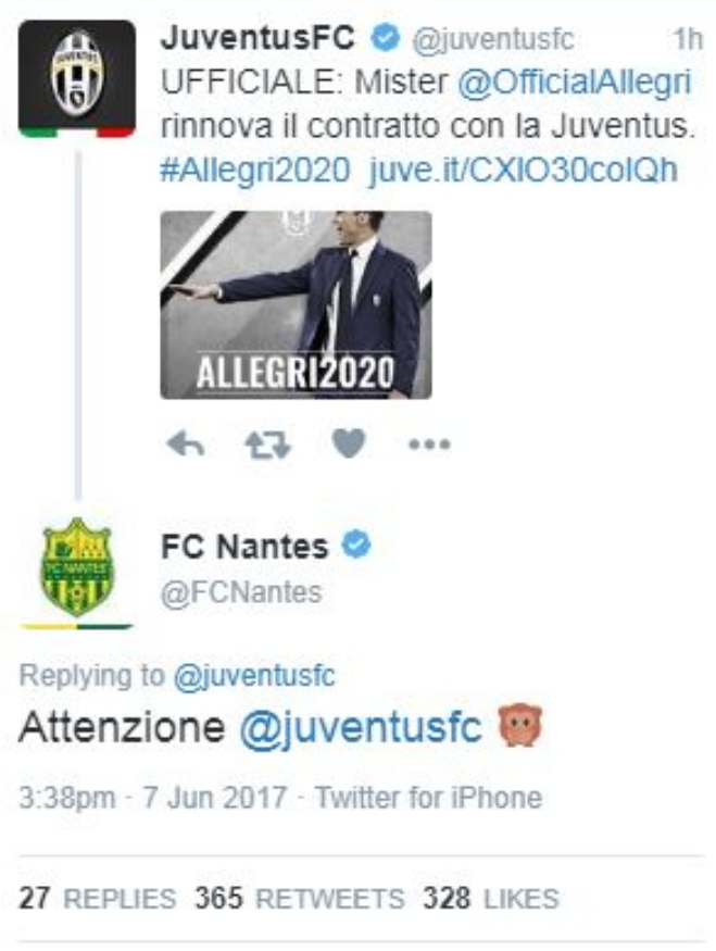 Con il rinnovo fino al 2020, la Juventus ha voluto blindare Max Allegri. Ma da Twitter arriva un “avvertimento” ai bianconeri, l’account ufficiale del Nantes ha infatti risposto al tweet juventino con due semplici parole “Attenzione Juventus” corredate dall’emoticon a bocca chiusa delle famose tre scimmiette sagge.