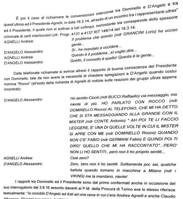 I rapporti diretti tra il presidente della Juventus Andrea Agnelli e Rocco Dominello, figlio di un boss della ndrangheta, sono documentati da due intercettazioni e da una testimonianza dello stesso Dominello resa nel corso dell’interrogatorio in carcere. I documenti che contraddicono quanto affermato dall’avvocato della Juventus Luigi Chiappero nell’audizione in commissione Antimafia sono contenuti nel deferimento del procuratore della Figc Giuseppe Pecoraro, avvenuto in settimana e citato non a caso oggi dalla presidente della commissione Rosy Bindi per contestare a Chiappero quanto affermato in entrambi le audizioni rese a San Macuto.