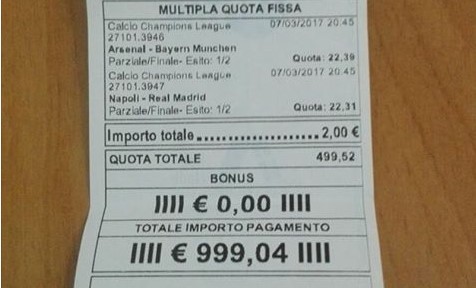Scommettitore indovina tutto su Napoli-Real e Arsenal-Bayern: sbanca con 2 euro [FOTO]