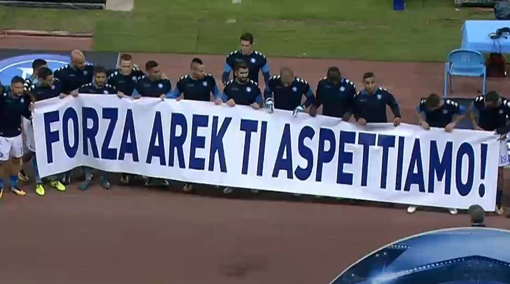 Oltre ai molteplici messaggi via social recapitati, i calciatori azzurri sono entrati in campo con uno striscione di incoraggiamento per il gigante di Tychy, con la speranza e l’augurio che possa tornare al più presto.