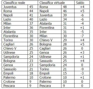 Curiosa classifica virtuale di Serie A stilata da AreaNapoli.it, una speciale graduatoria ripulita da tutti gli errori arbitrali. Perde decisamente terreno la Juventus (39) che dopo la sconfitta di Firenze è lontana ben nove punti dalla Roma (48) e sette punti dal Napoli (46).