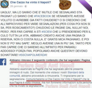 Da qualche anno i tifosi napoletani chiedevano insistentemente la rimozione della pagina Facebook “Che c***o ha vinto il Napoli”, creata da tifosi juventini campani che dava sfogo a post razzisti e di odio nei confronti di Napoli e dei napoletani. Per fortuna il social più popolare al mondo ha deciso di chiuderla, su segnalazione di tantissimi tifosi partenopei radunati nella pagina “Pariare sugli anti Napoli”. Una bella notizia per tutti i tifosi del club azzurro.