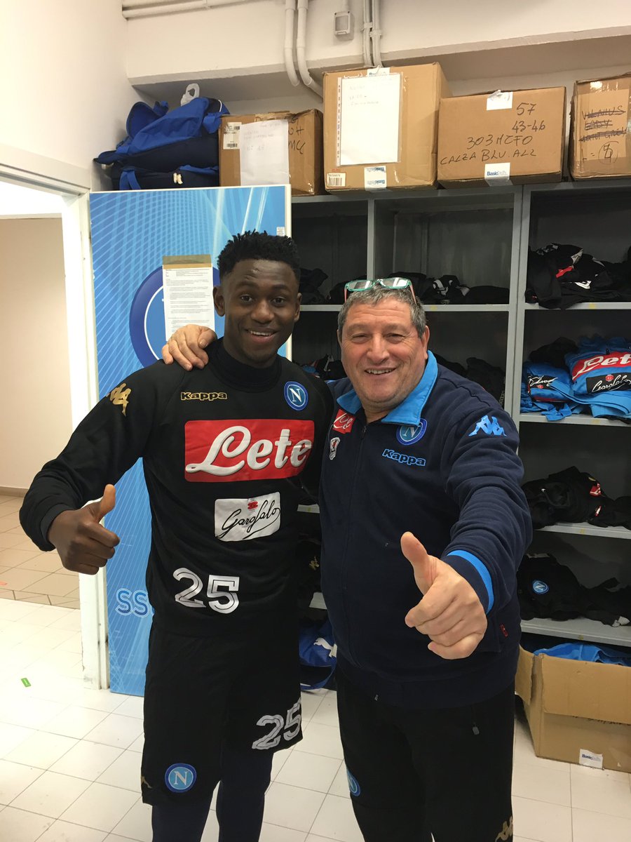 Amadou Diawara in posa con lo storico massaggiatore azzurro Tommaso Starace, il centrocampista, sempre sorridente, è una delle sorprese più belle della stagione del Napoli. Acquistato dal Bologna, ha impiegato pochi mesi per entrare fin da subito nel cuore della tifoseria napoletana, che l’ha eletto tra i nuovi idoli più acclamati del San Paolo.
