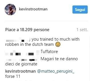 In attesa di capire l’entità della squalifica di Kevin Strootman dopo la prova tv, il centrocampista giallorosso è stato bersagliato sui social. Ad un tifoso che gli augurava 10 giornate di squalifica, il giocatore olandese ha risposto così: “Forse 11”.