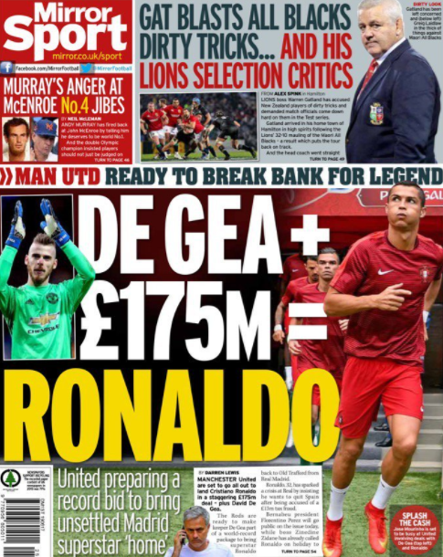 Non si placa l’interesse dei top club internazionali per Cristiano Ronaldo. Dall’Inghilterra il giornale ‘Mirror‘ lancia in prima pagina l’indiscrezione di un’offerta del Manchester United per il fuoriclasse portoghese. I Red Devils avrebbero proposto al Real Madrid 175 milioni di sterline più il cartellino di David de Gea, da tempo obiettivo dei Blancos. Ecco quanto analizzato da Eurosport: “La pentola bolle sempre di più e, se dovessero essere vere le voci che parlano di un CR7 determinato non soltanto ad andarsene ma anche a tornare a Manchester, saremmo di fronte a un affare pazzesco ormai fatto o quasi. Detto ciò, restano ancora da chiarire dettagli che dettagli non sono. Prima di tutto non è da escludere che Florentino Perez faccia due conti e si decida a pagare la multa che spetterebbe a Cristiano Ronaldo. Perchè sì, se il problema è quello e se il Real Madrid vuole davvero trattenere il proprio asso, non resta che accontentarlo…”.