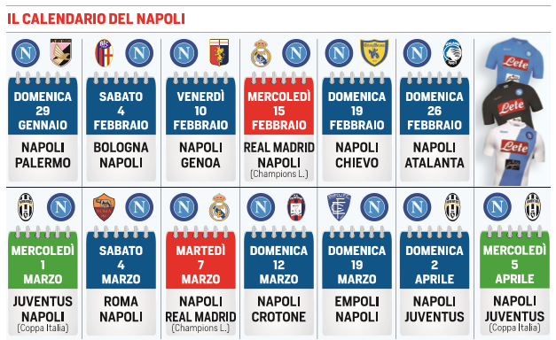 L’edizione odierna del Corriere dello Sport mette in evidenza il calendario fitto di impegni del Napoli, che comincia domenica col Palermo, fino alle super sfide con la Juve di aprile. Si parte domenica sera contro i rosanero, poi ci si sposta per un sabato a Bologna, si accorciano le distanze tra una partita e l’altra e si arriva al San Paolo con il Genoa ed eccola qua la prima data: 15 febbraio, Santiago Bernabeu, Real Madrid-Napoli, come in una favola. Sarà la tappa più elettrizzante di febbraio, che poi consegnerà – con rispetto parlando – altra normalità: il Chievo e l’Atalanta, quindi trascinerà nella «perdizione».