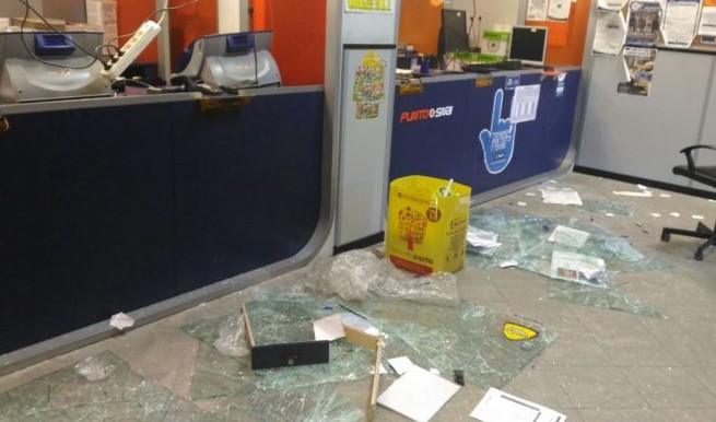 Intorno alle 21, 05, poco dopo l’inizio della gara della Juventus, l’uomo è entrato munito di palo in ferro ripieno di calce (cm 8×170 circa) e ha iniziato a danneggiare le barriere di protezione degli impiegati e vari oggetti di arredo (tra cui alcuni monitor) costringendo i dipendenti a consegnare l’incasso della giornata.
